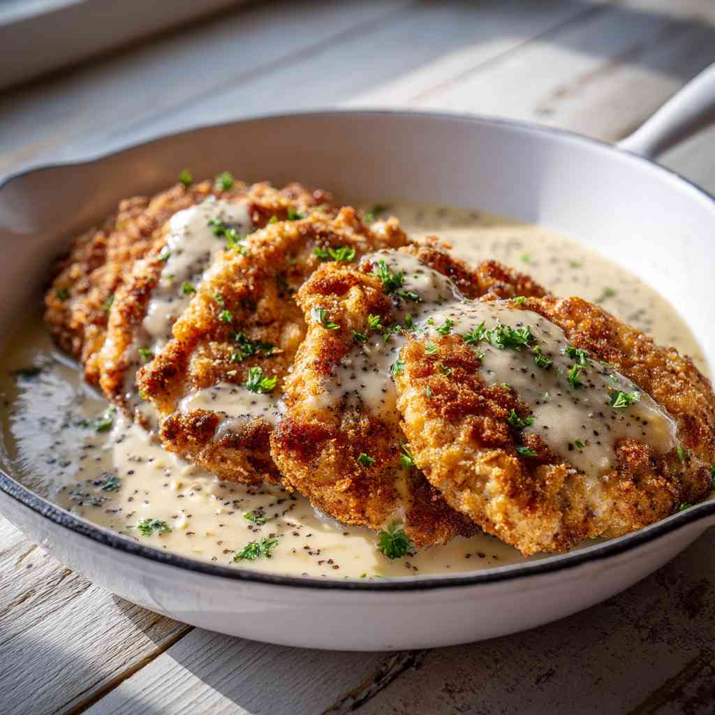 The cream gravy ties everything together, silky and rich, soaking into every bite.